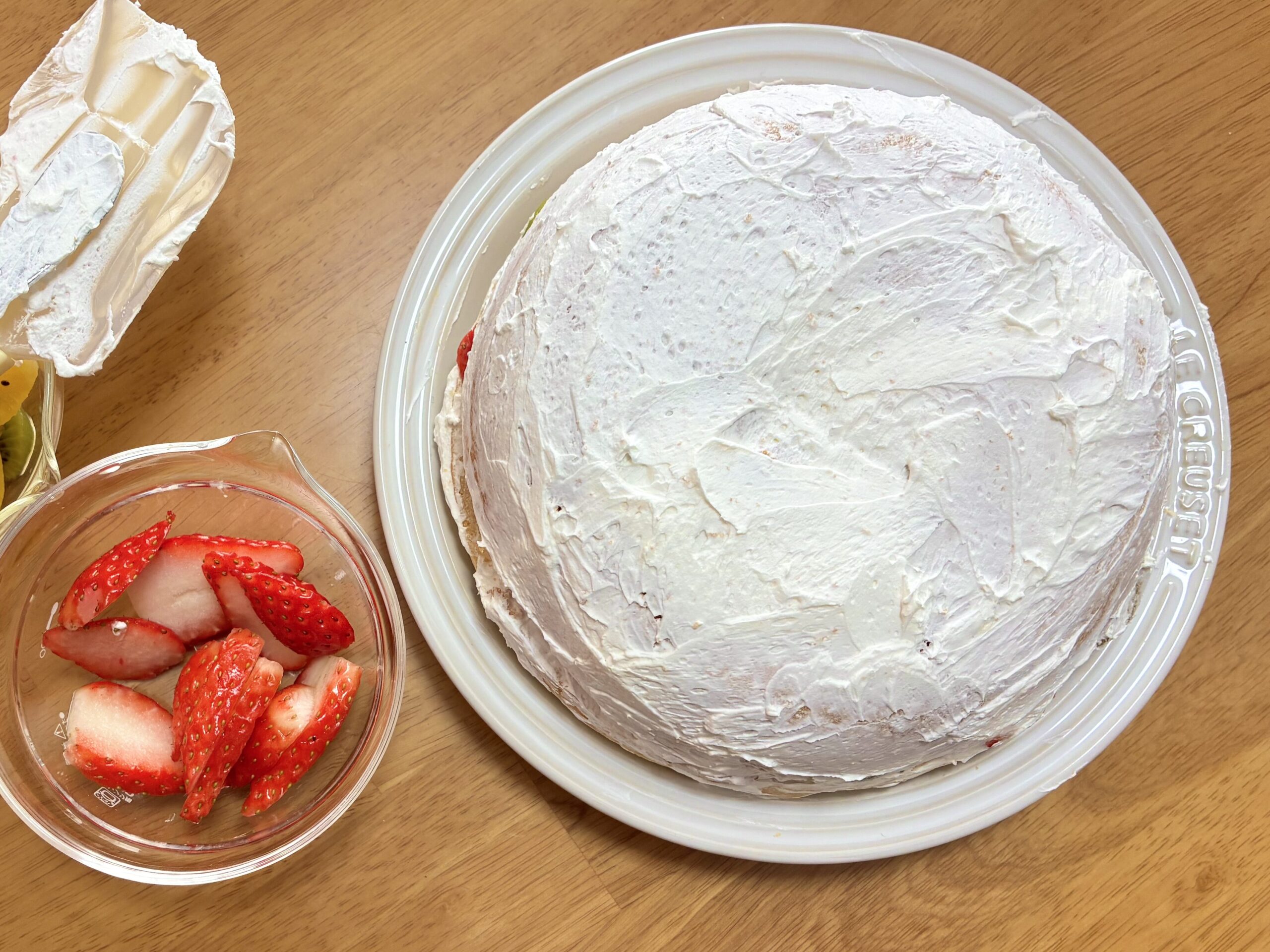私の場合はケーキ本体を横半分に切って2段にし、間にもフルーツとクリームを挟む形にしました