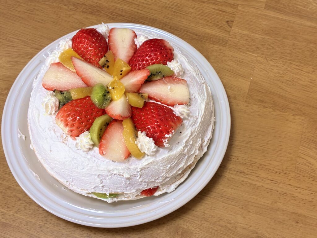 3. ケーキが冷めたらお好みで飾り付け、クリームを塗って完成です!